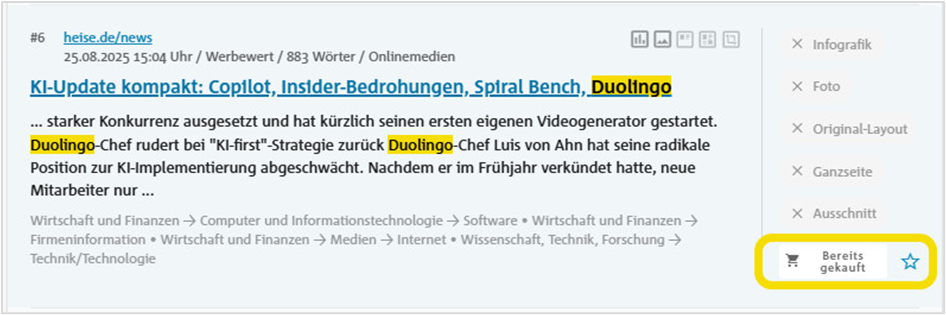 3. Kennzeichnung „Bereits gekauft“ verlängert