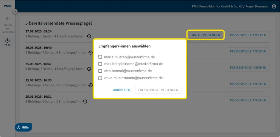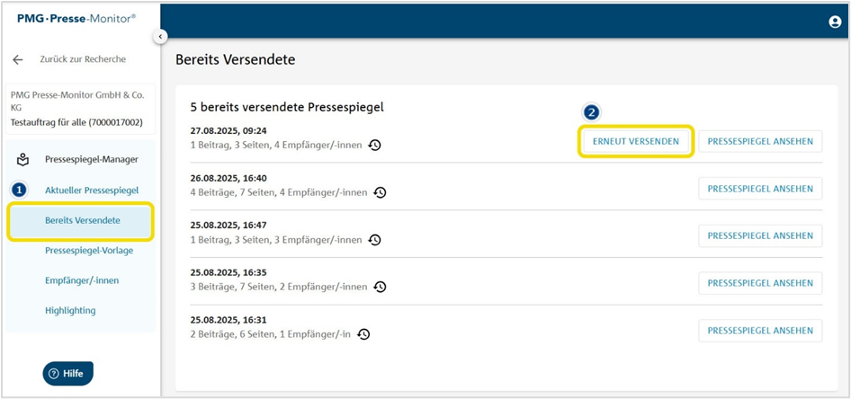 - Der letzte verschickte Pressespiegel lässt sich per Klick erneut an Ihren gesamten Verteiler oder an einzelne Empfänger versenden.