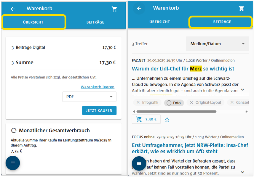 Im Warenkorb erscheinen die Übersicht und die Liste der Beiträge auf einer Seite.