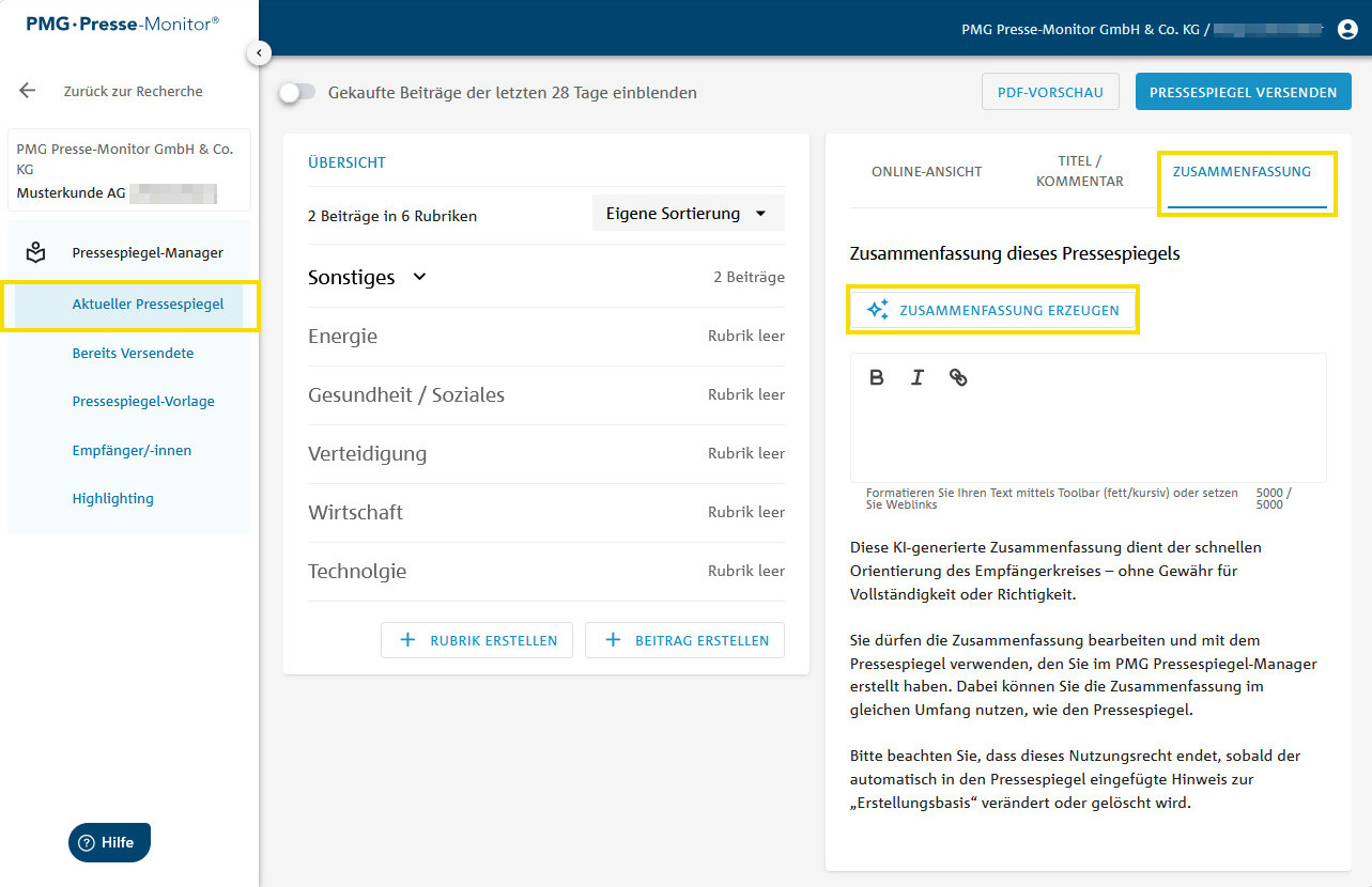 - Die KI erstellt daraufhin automatisch eine Zusammenfassung aller Beiträge im Pressespiegel
