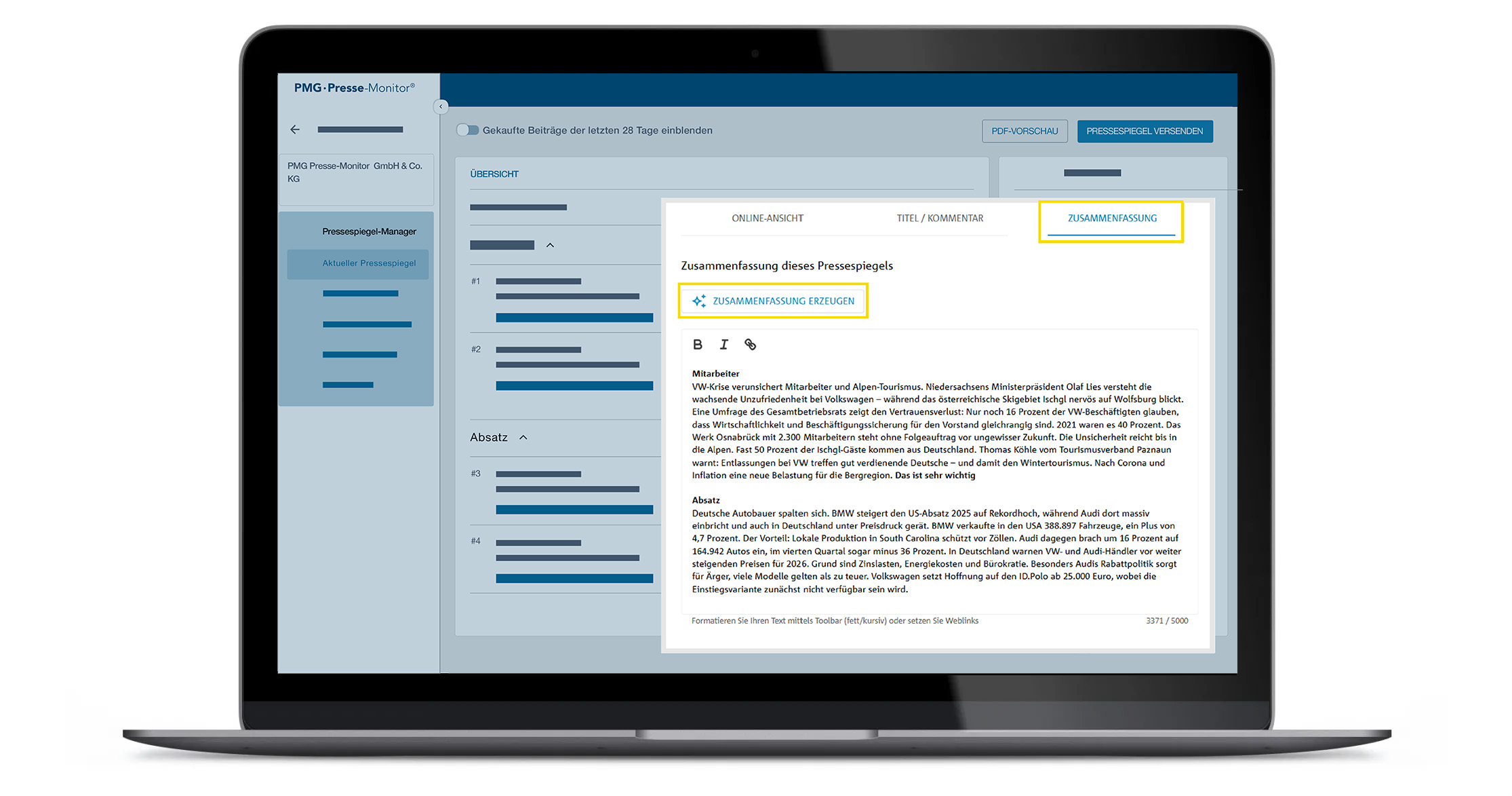 KI-generierte Zusammenfassungen der Beiträge in einem Pressespiegel ermöglichen jetzt eine noch schnellere Orientierung der Empfänger.