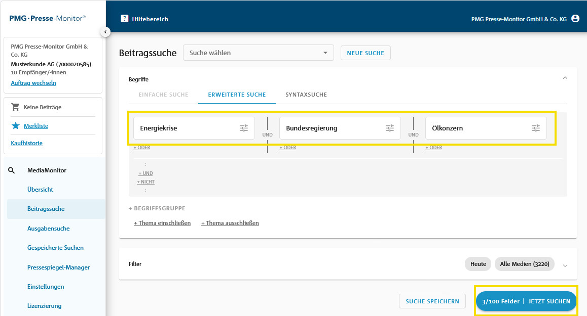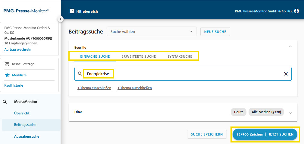 In den drei Suchbereichen (EINFACHE SUCHE, ERWEITERTE SUCHE, SYNTAXSUCHE) informiert eine Anzeige im Button „JETZT SUCHEN“ über die Anzahl der bereits verbrauchten Zeichen bzw. Eingabefelder und die maximal verfügbare Anzahl für Ihre Eingaben.
