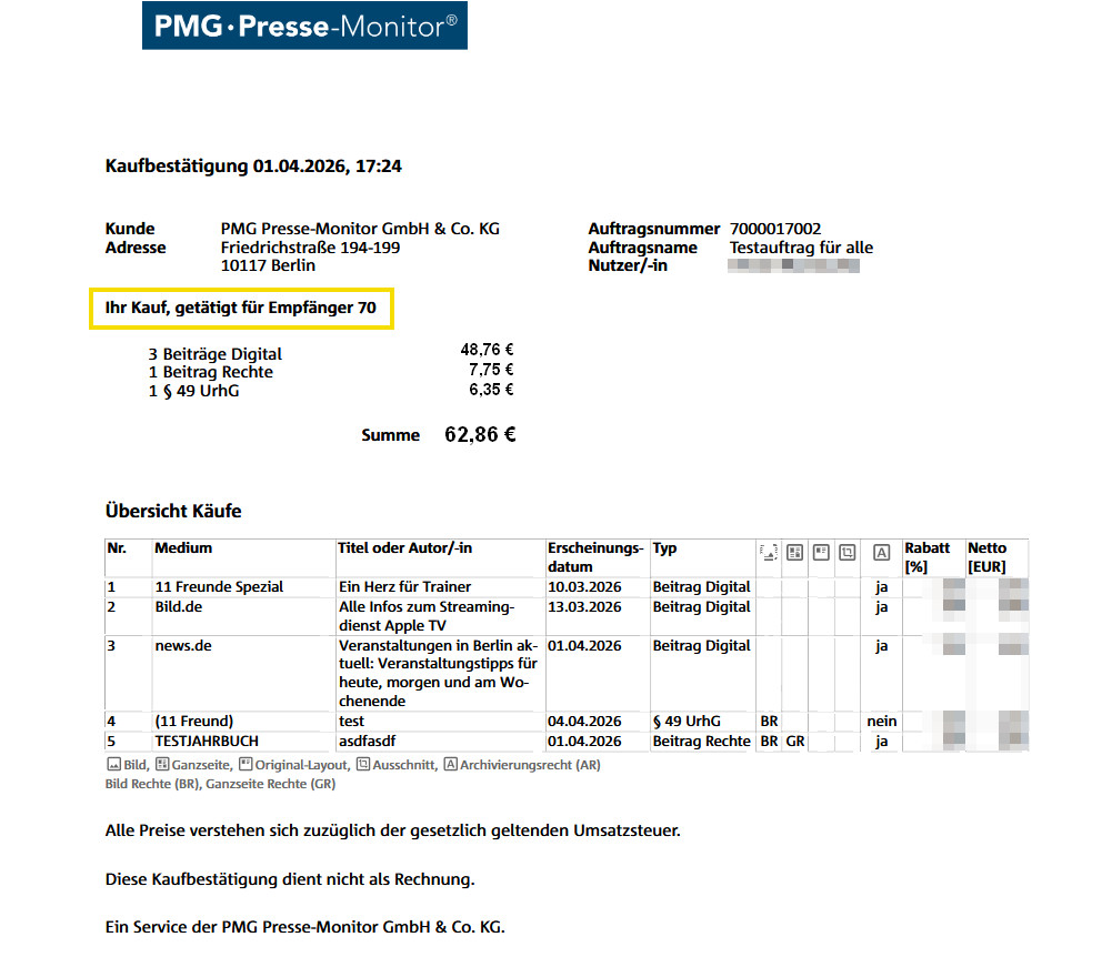 4. PDF-Kaufbestätigung weist Anzahl der Pressespiegel-Empfänger aus