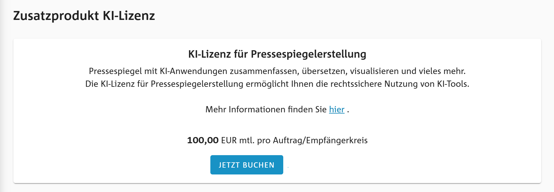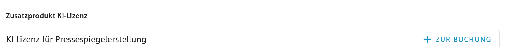 Wählen Sie das Zusatzprodukt „KI-Lizenz für Pressespiegelerstellung“ aus und klicken Sie auf „Jetzt buchen“.