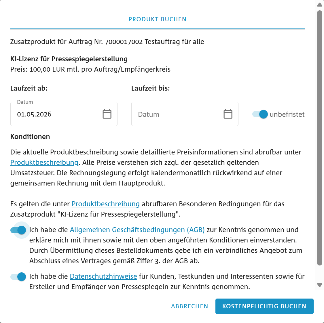 Daraufhin öffnet sich ein weiteres Fenster, in dem Sie die gewünschte Vertragslaufzeit festlegen können. Für eine unbefristete Buchung aktivieren Sie bitte den entsprechenden Regler.