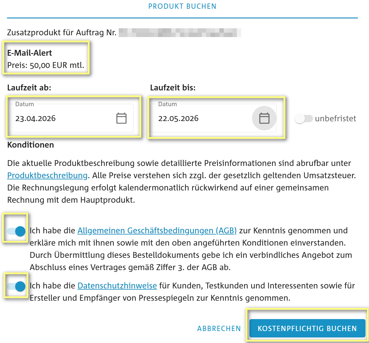 Daraufhin öffnet sich ein weiteres Fenster, in dem Sie die gewünschte Vertragslaufzeit festlegen können. Für eine unbefristete Buchung aktivieren Sie bitte den entsprechenden Regler.